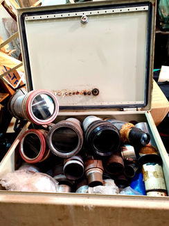 Há também no acervo pelo menos vinte e quatro lentes acondicionadas em uma caixa, variando em tamanho e focalização, o que indica o uso em diferentes distâncias e formatos de tela. São elementos ópticos de precisão, indispensáveis para o foco e a nitidez da imagem projetada. Dentre as marcas identificadas, estão as francesas Kinoptik e Pathé Frères, e a estadunidense Simplex.